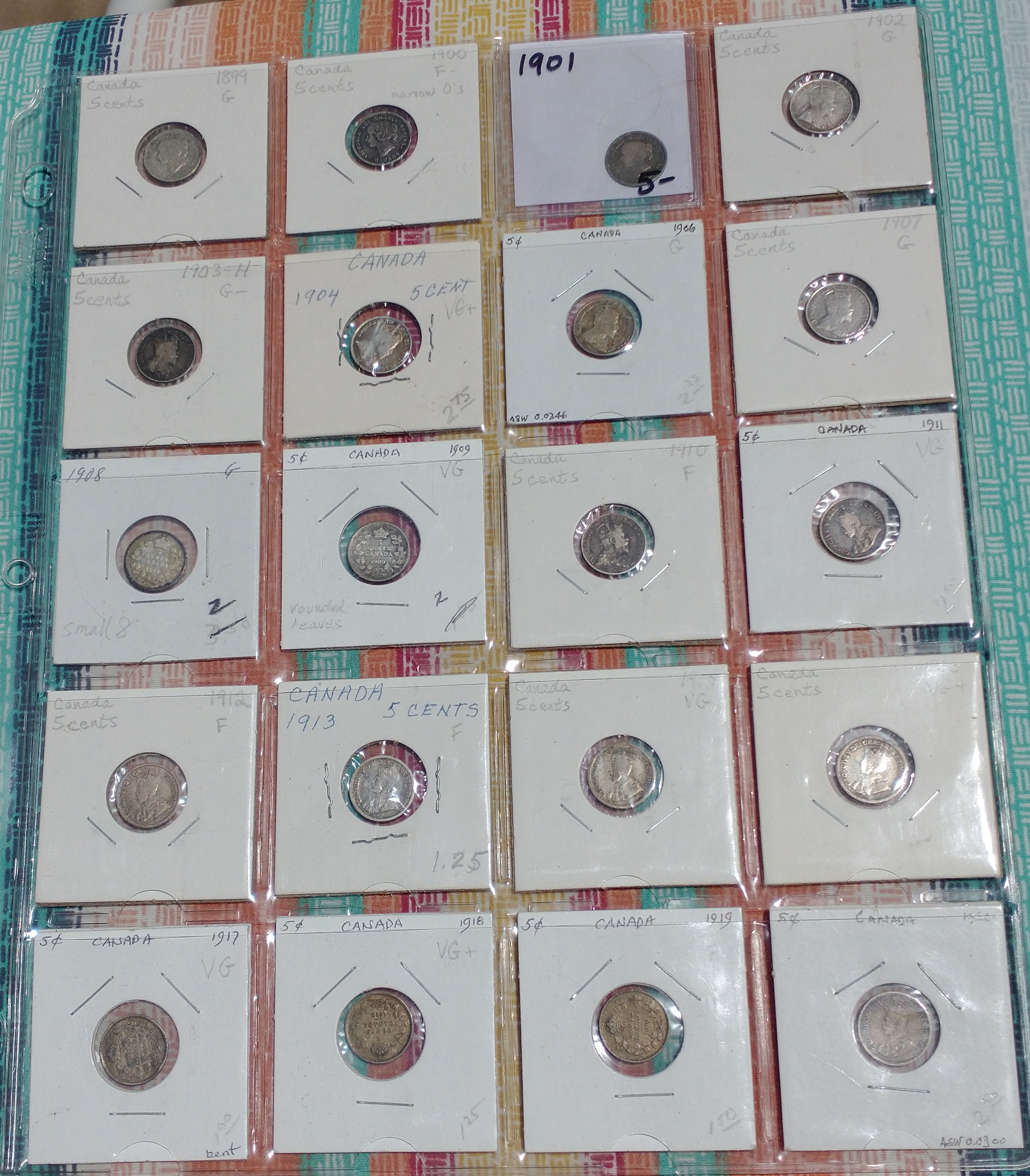 The current special, from my own set of extras of course, is a set of 20 silver 5 cent pieces from Canada. They have a catalog value (as of May 13, 2025 on ngccoin.com) of $44.65. The special price is $35. If you want them, submit a request and ask for the special. The coins are listed below with date, grade and catalog value (or silver value).